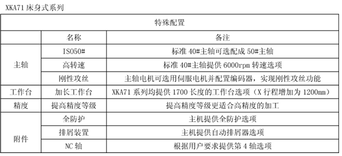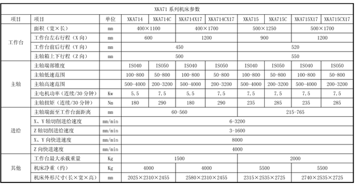 XKA71系列機床是使用范圍很廣的數控銑床,它的橫向(Y向)移動由底座上的滑座來完成,滑座上的工作臺可縱向(X向)移動,立柱上的主軸箱可進行垂向(Z向)移動。工作臺、滑座、主軸箱的移動共同組成了機床X、Y、Z三個軸線方向的運動,可實現三坐標三聯動。三坐標均為滑動導軌,具有承載大、運動平穩(wěn)、剛性好的特點。 XKA71系列機床采用變頻器實現主軸轉速的無級自動調速,主軸電機與主軸之間由液壓自動兩級齒輪變檔,保證低速區(qū)的大扭矩和高速區(qū)的大功率的協調,主軸剛性高,保證主軸加工時的平穩(wěn)性和強力切削實現零件的高表面光潔度。 該機床根據用戶要求可以配置德國西門子828D、FANUC-0iMD、華中818B和廣數983M等數控系統,適用于各行業(yè)的機械零件加工。 XKA71系列產品可根據用戶需要選擇特殊配置。