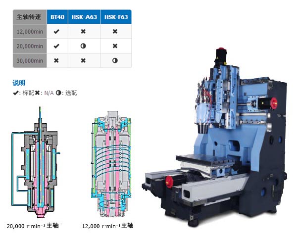 12,000轉(zhuǎn)主軸以前端四個(gè)角接觸混合軸承為支撐,提供了主軸強(qiáng)大的剛性和卓越的重切削能力。配以夾套冷卻,主軸的熱伸長通過一個(gè)2600kcal/h的散熱器可得到很好的控制,散熱器的流速為25L/min,可帶走主軸軸承上的熱量。
